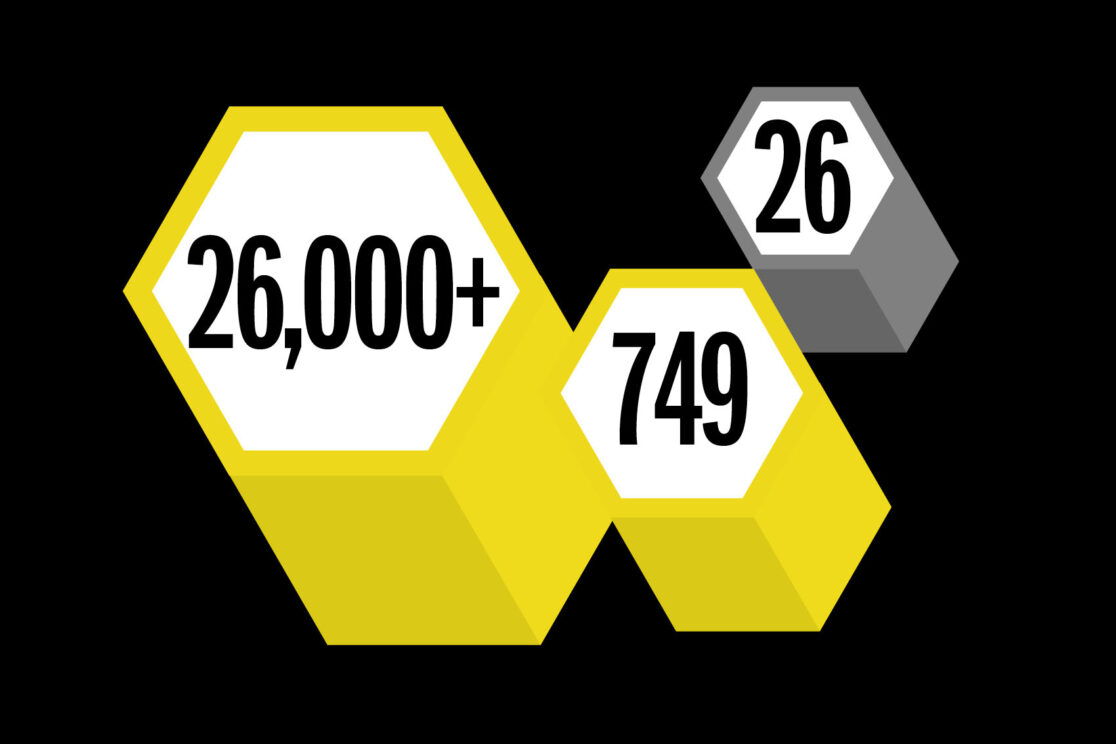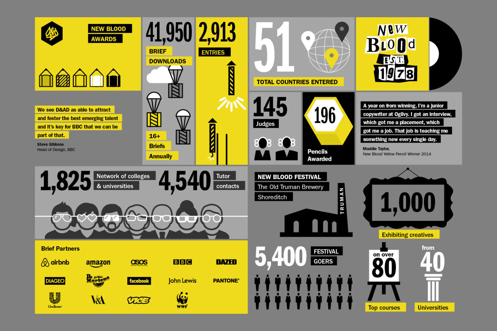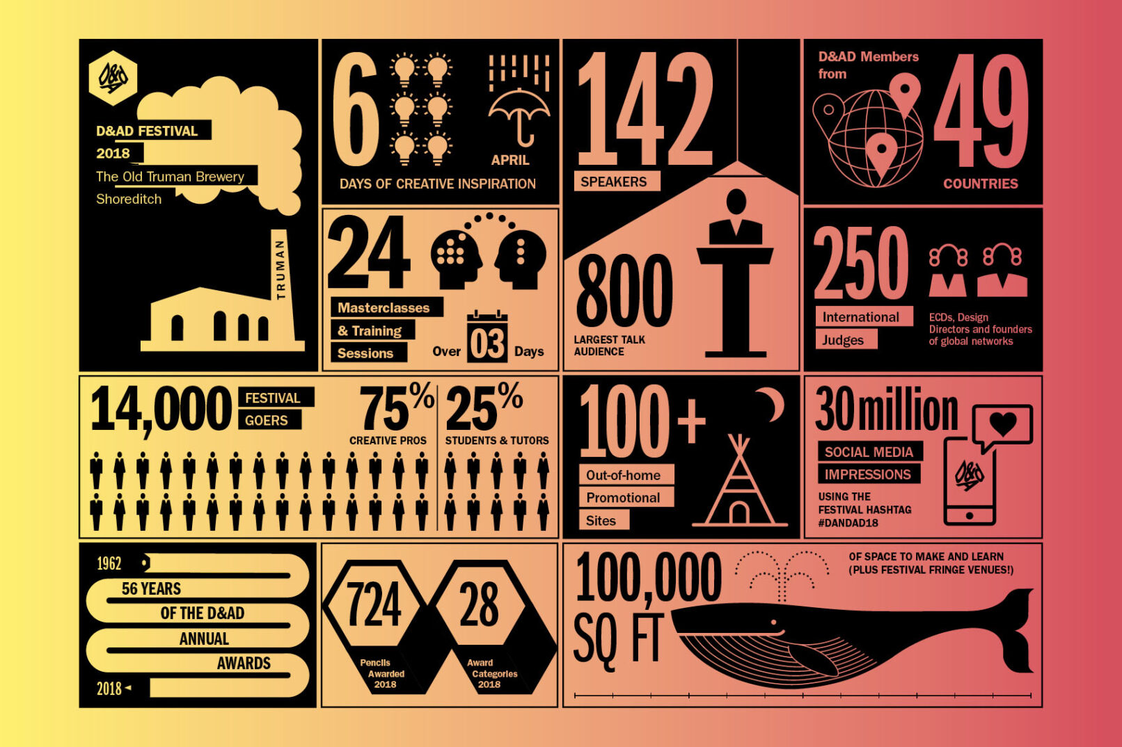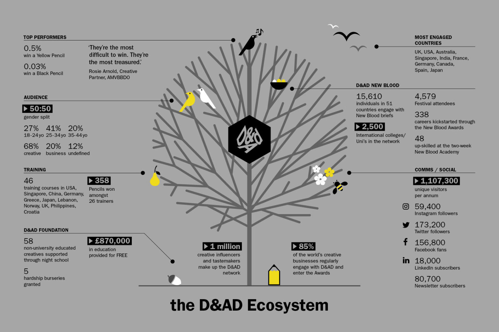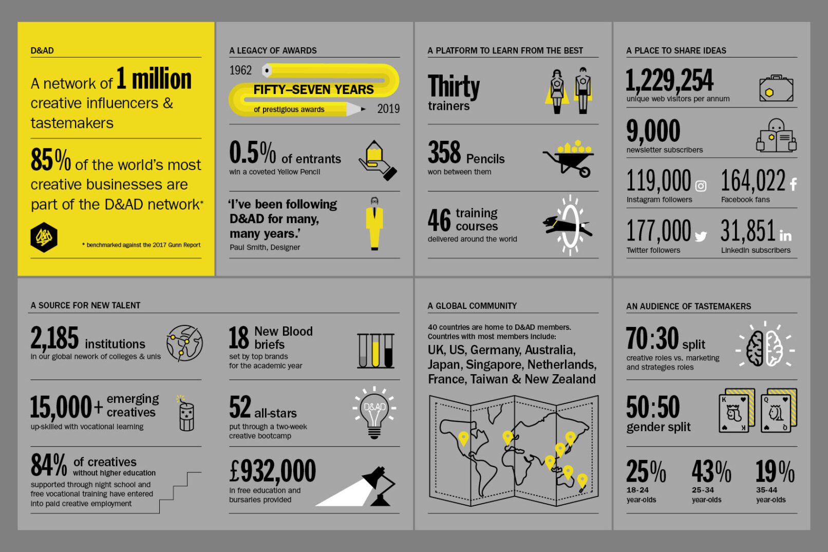 Infographic design treatments for D&AD’s activities across its various programmes.
