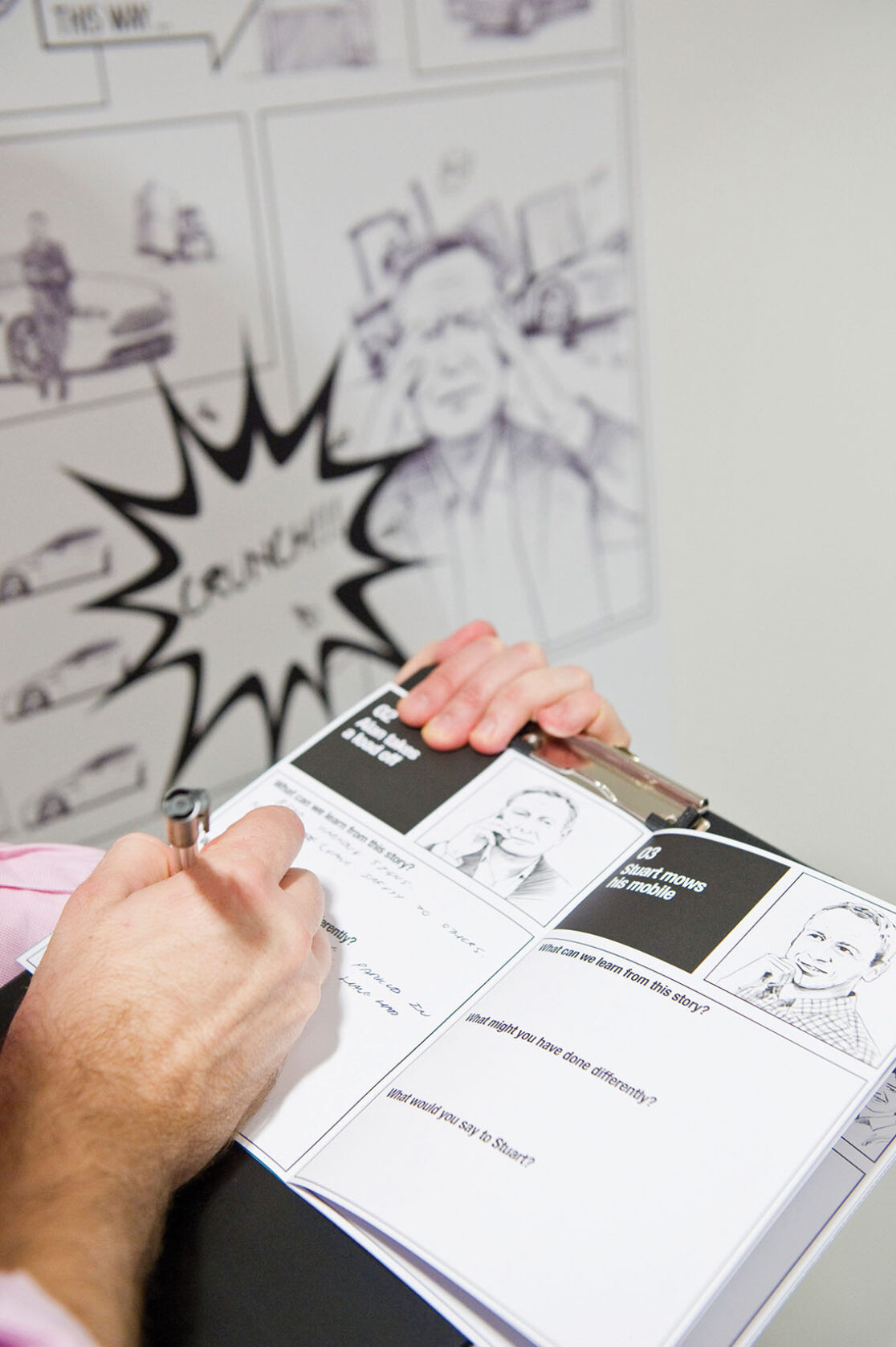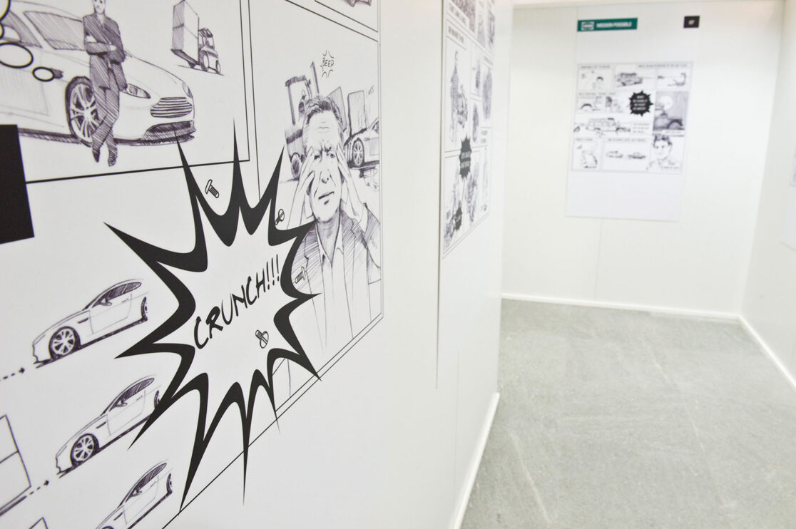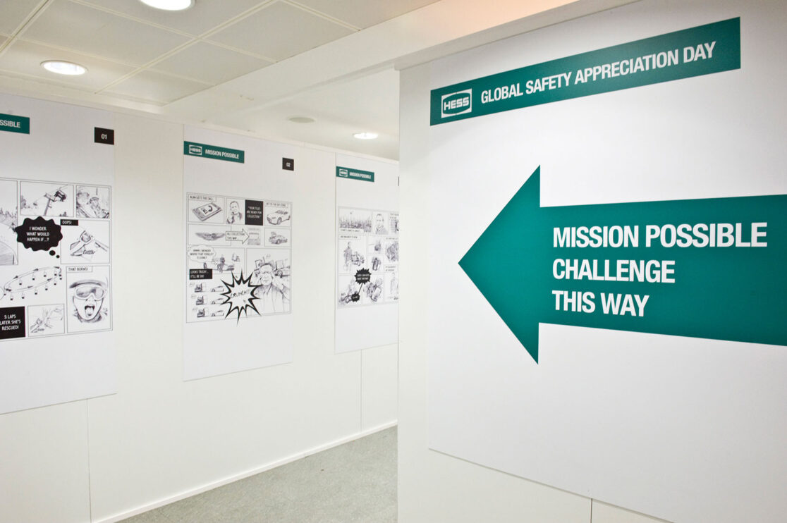 For an internal health and safety initiative commissioned illustrations and stories from the everyday lives of a range of Hess employees were pulled together into 12 separate graphic stories. These were then produced as panels and mounted as part of a walk through maze in their basement exhibition space.