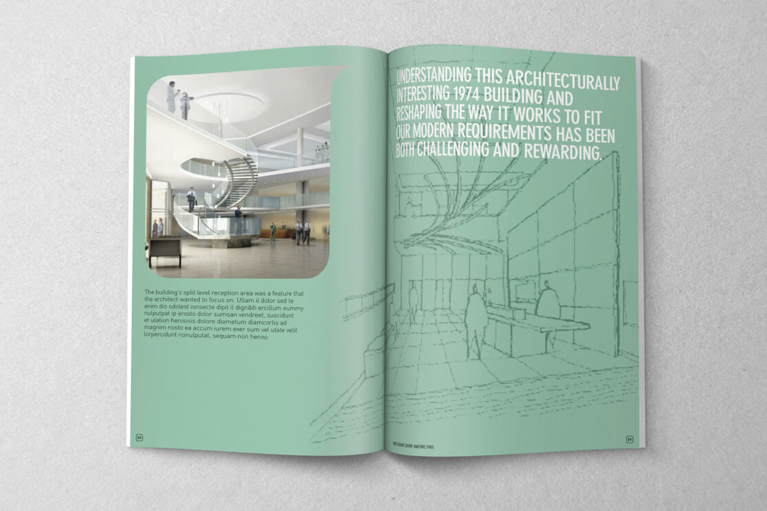 The look and feel takes inspiration from the shadows and curves of the external architecture. The brand language translates directly into the environment including interior furnishing and directional signage.